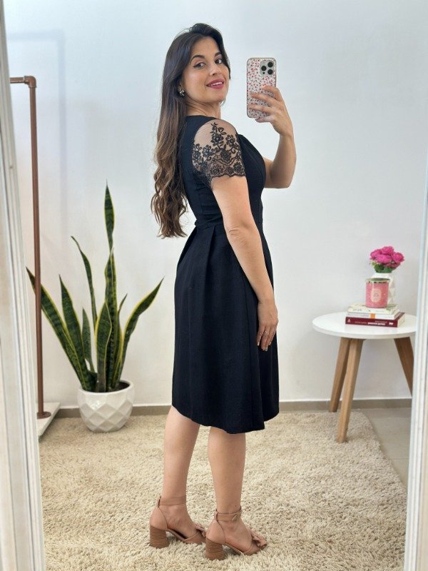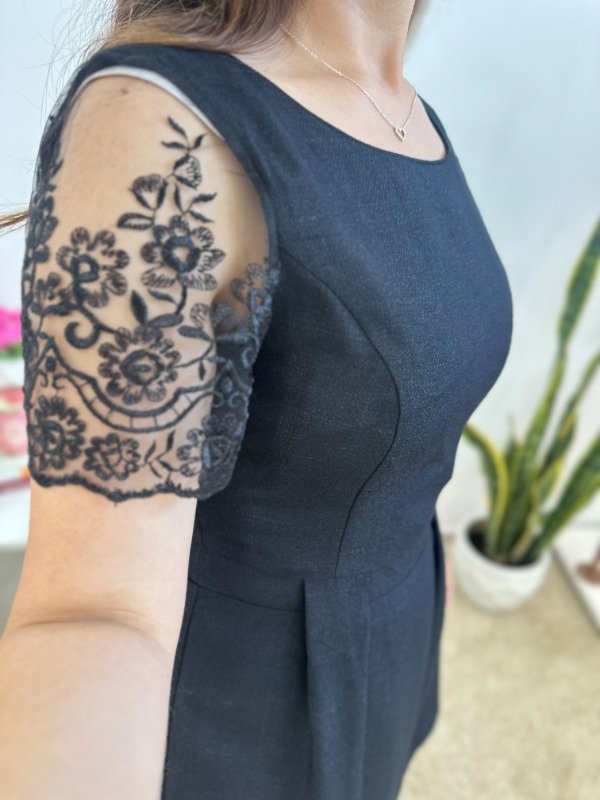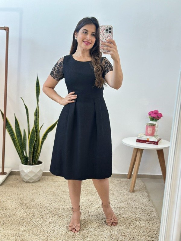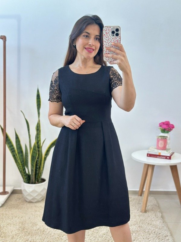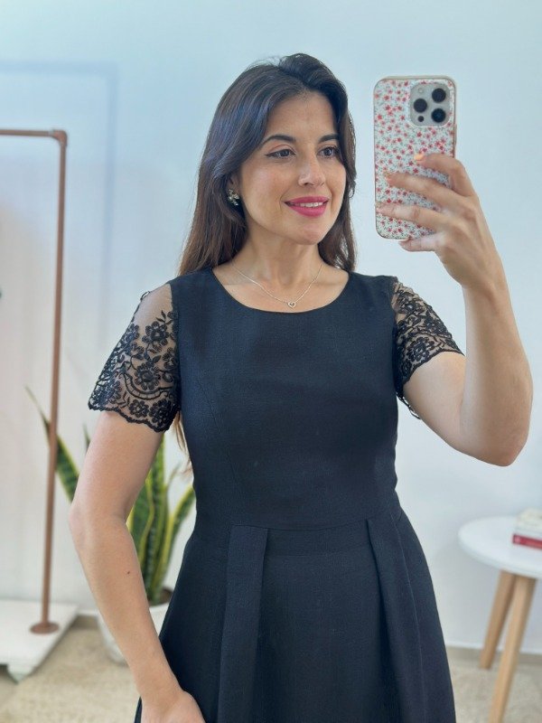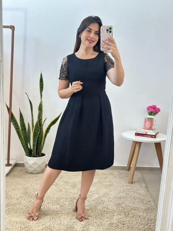 Precioso vestido importado, de excelente calidad, elaborado en material con muy leve spandex y completamente forrado en su interior. Con escote circular, mangas con transparencia y cierre invisible en el lateral.