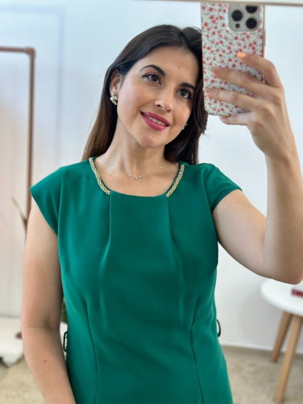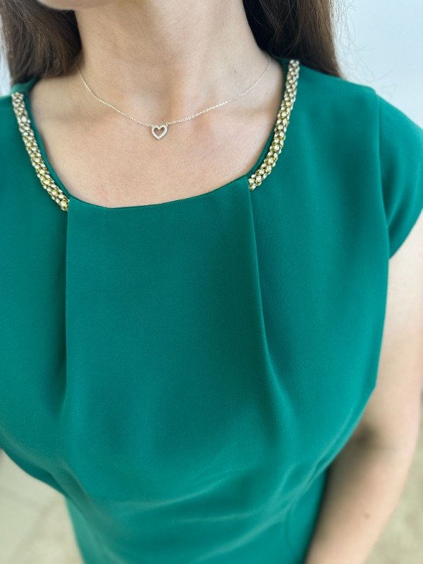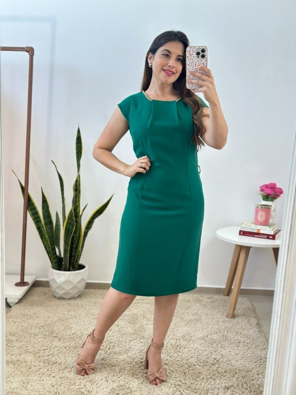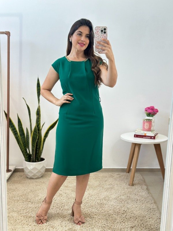 Precioso vestido importado, elaborado en material con spandex. Completamente forrado en su interior, de calidad premium. Con detalle de cadena brillosa en cuello y pliegue. Trae pasacinto en la cintura. Un modelo increíblemente femenino.