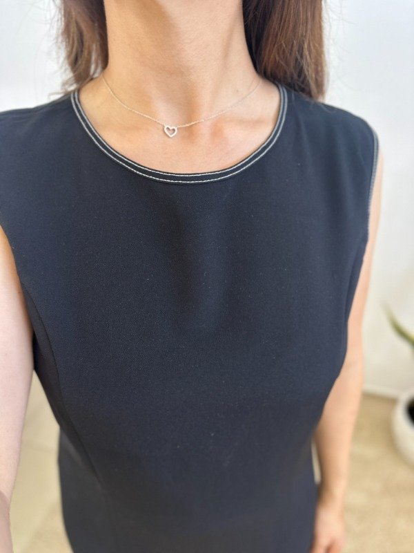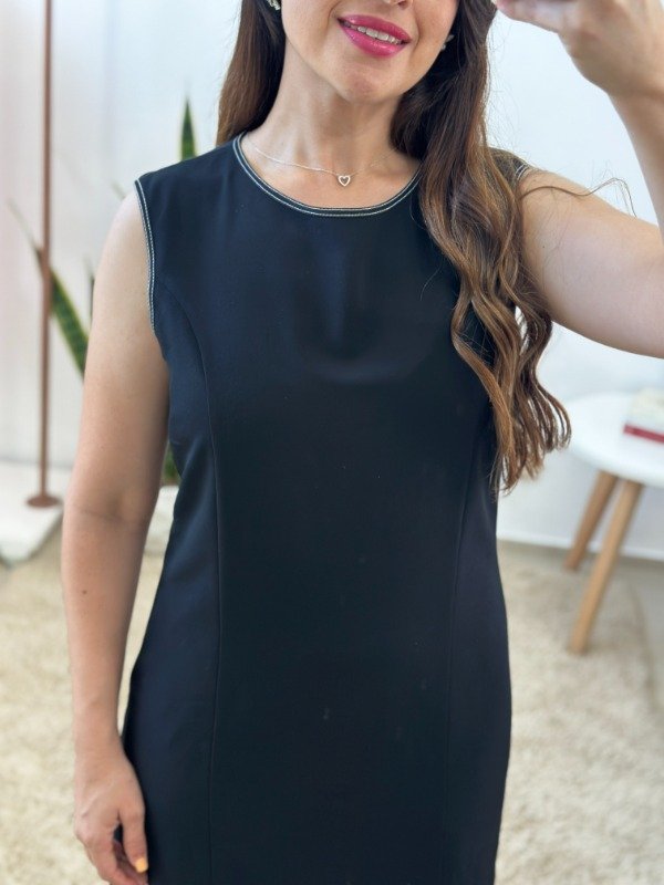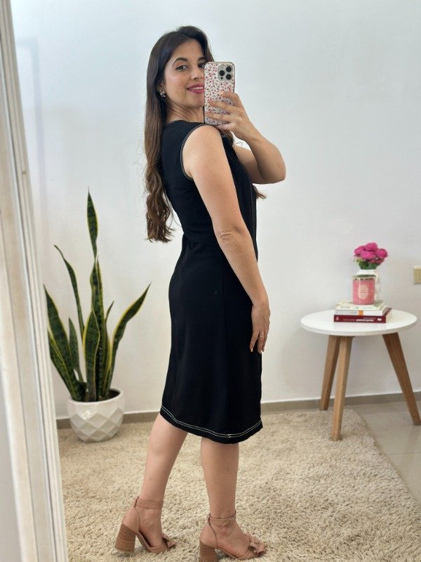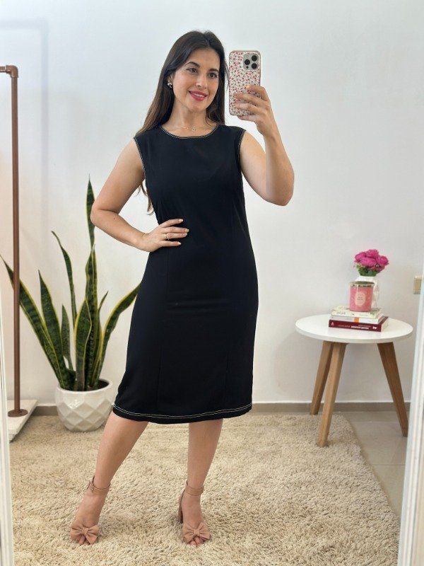 Precioso vestido importado, completamente forrado en su interior, de calidad premium. Con escote redondo y detalle de hilos blancos en en contraste con el negro en todos los bordes.
