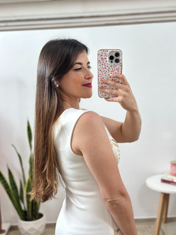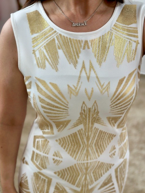 Precioso vestido importado de calidad increíble, completamente forrado en su parte trasera para evitar transparencias, con cierre en el lateral y detalles en dorado. Tela tipo neopreno, elastizada.