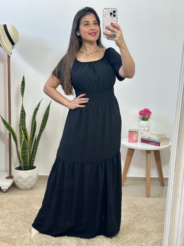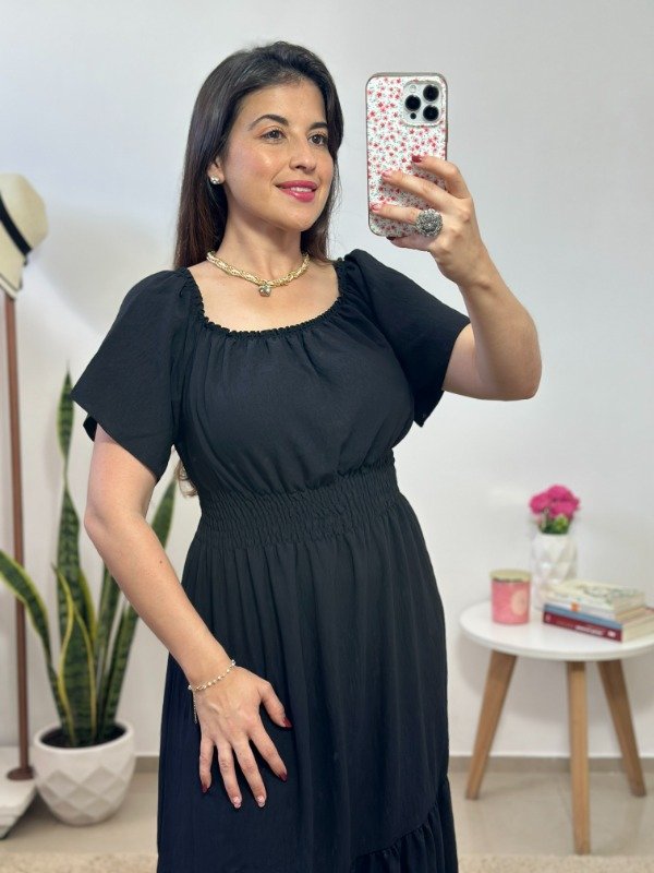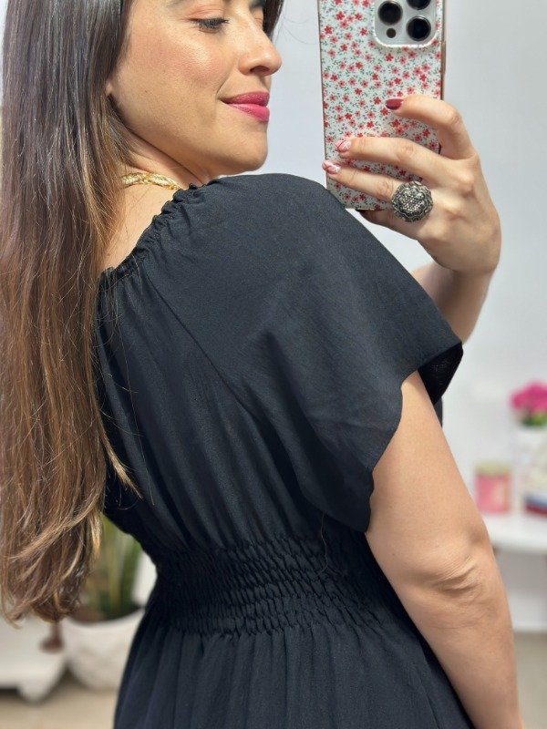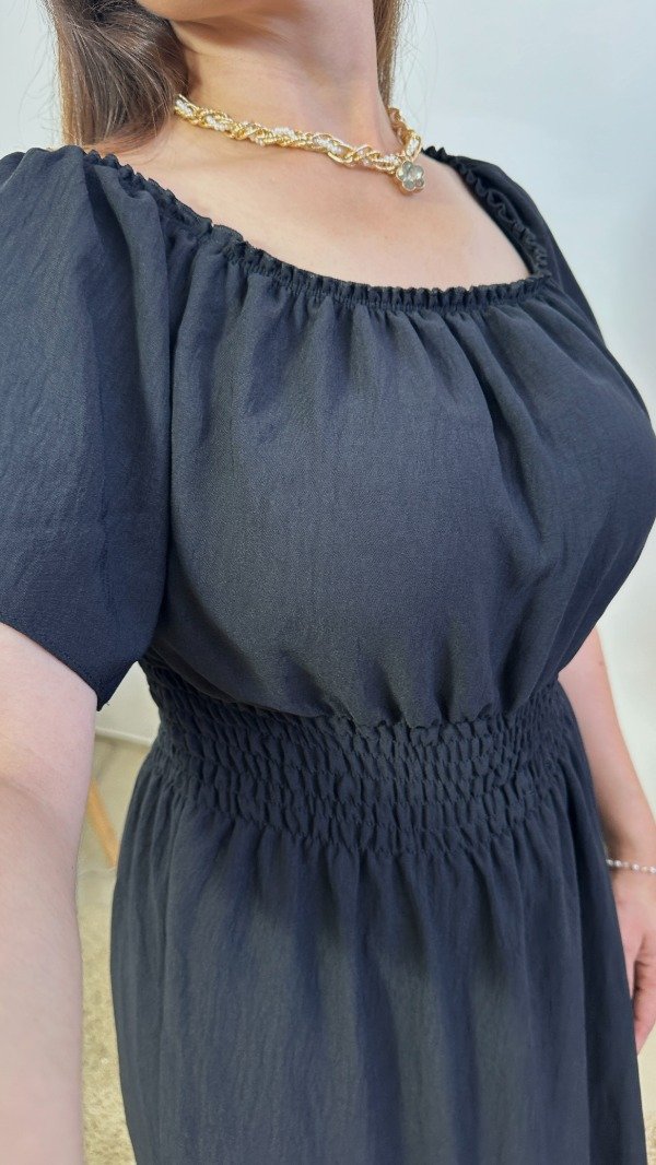 Con escote redondo elástico, fruncido completo en en cintura y un corte en la parte inferior de la falda que le brinda amplitud. En su interior incluye enagua.