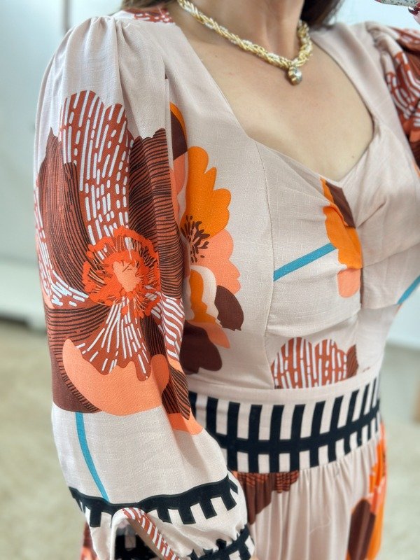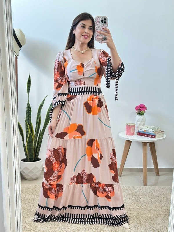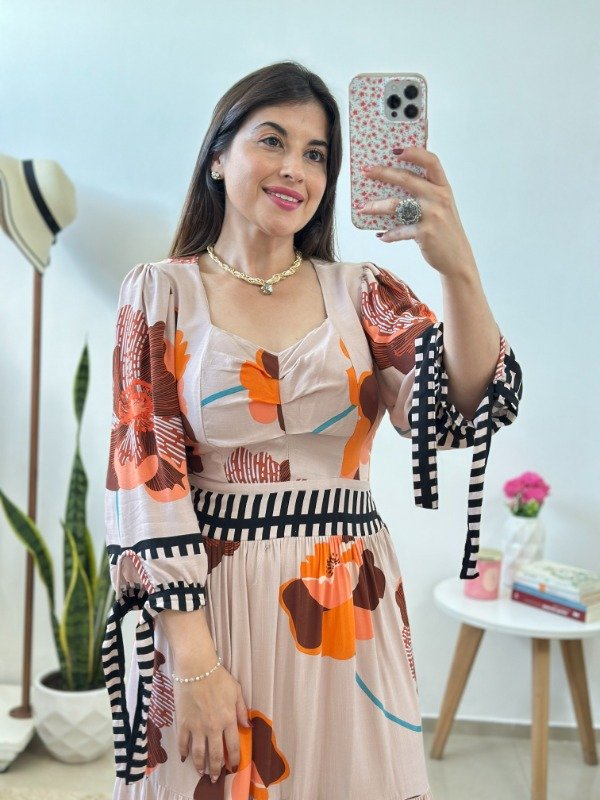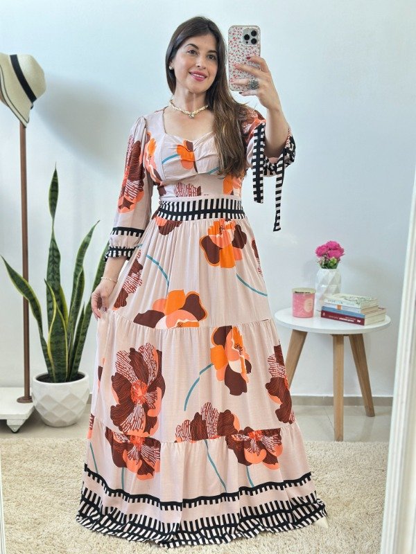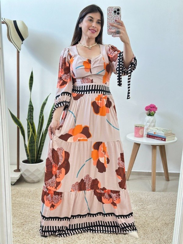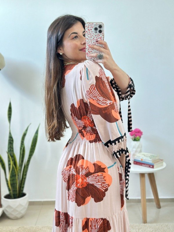 Con fruncido en parte trasera de cintura, lazo en mangas, falda con mucha amplitud y enagua en su interior. Un vestido hermosísimo, de una estampa de ensueño y mega cómodo.