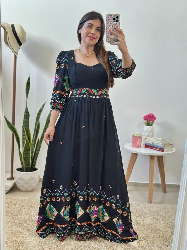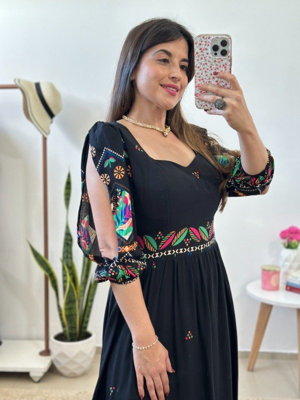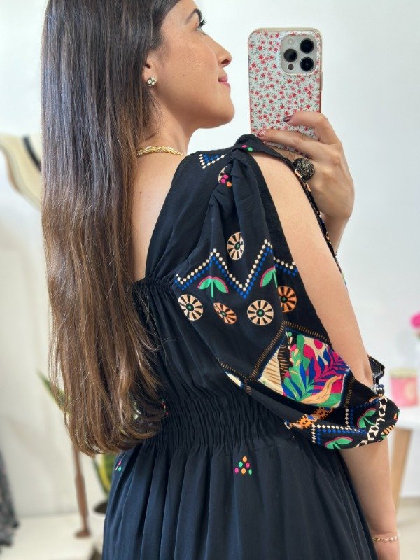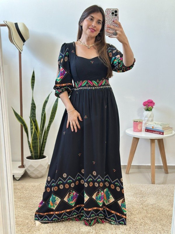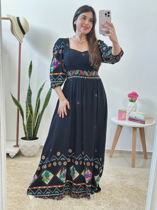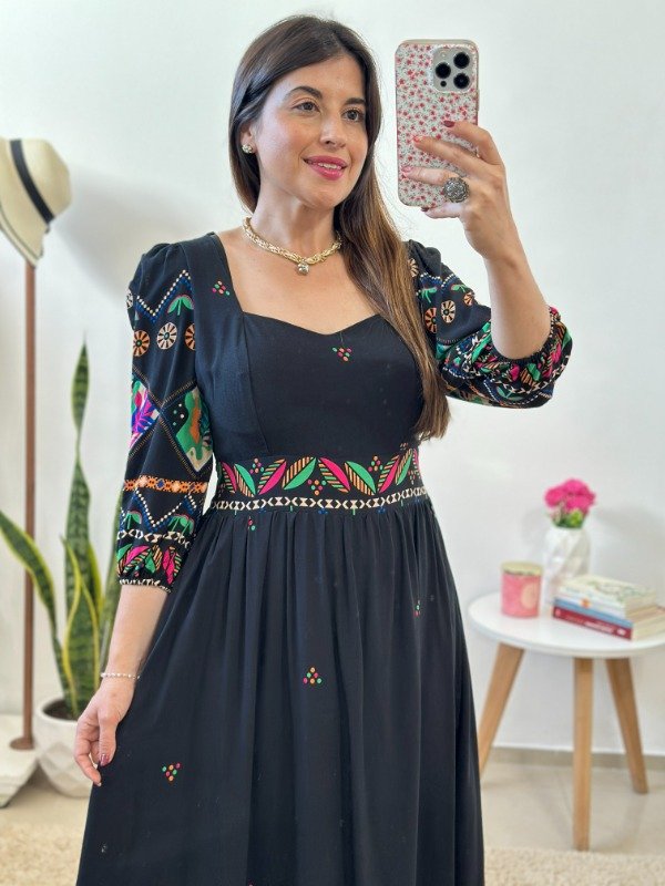 Precioso vestido importado, elaborado en material similar al lino de excelente calidad. Con fruncido en parte trasera de cintura, enagua en su interior, de una combinación de negro con detalles en distintos colores y abertura en manga, un vestido hermosísimo y mega cómodo.