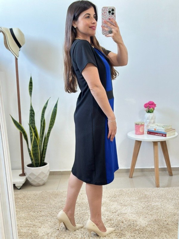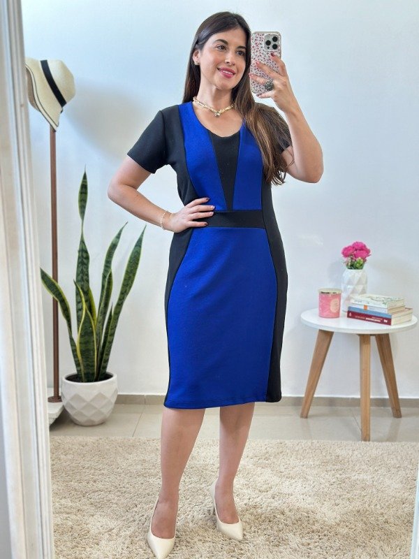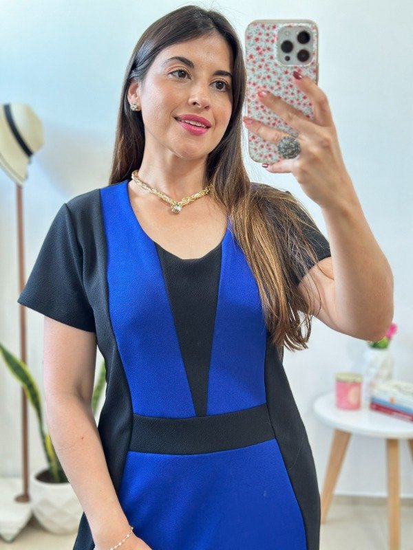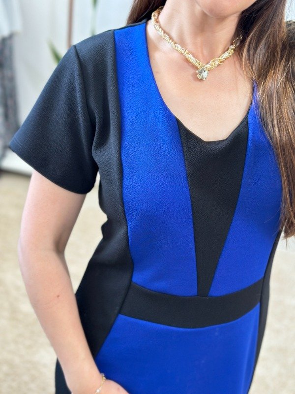 Precioso vestido importado, elaborado en crep con spandex. Con escote redondo y cortes geométricos en combinación de colores.