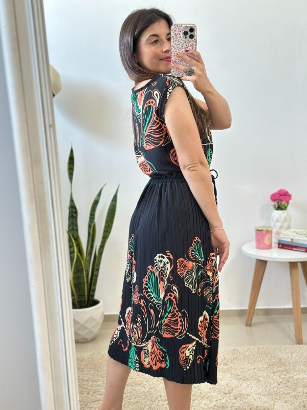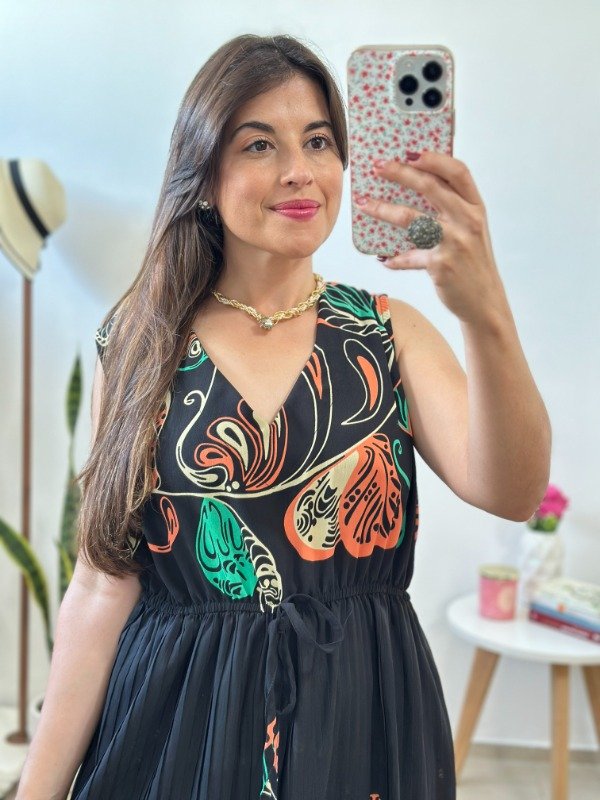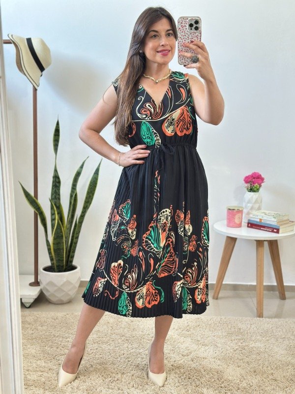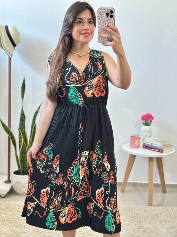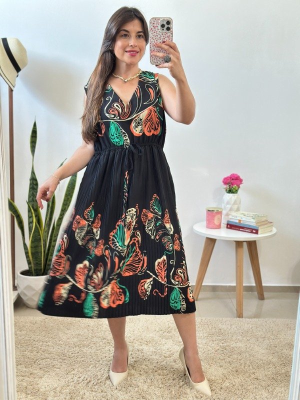Precioso vestido importado, elaborado en crep con spandex. Con escote en V, elástico en cintura y falda plisada